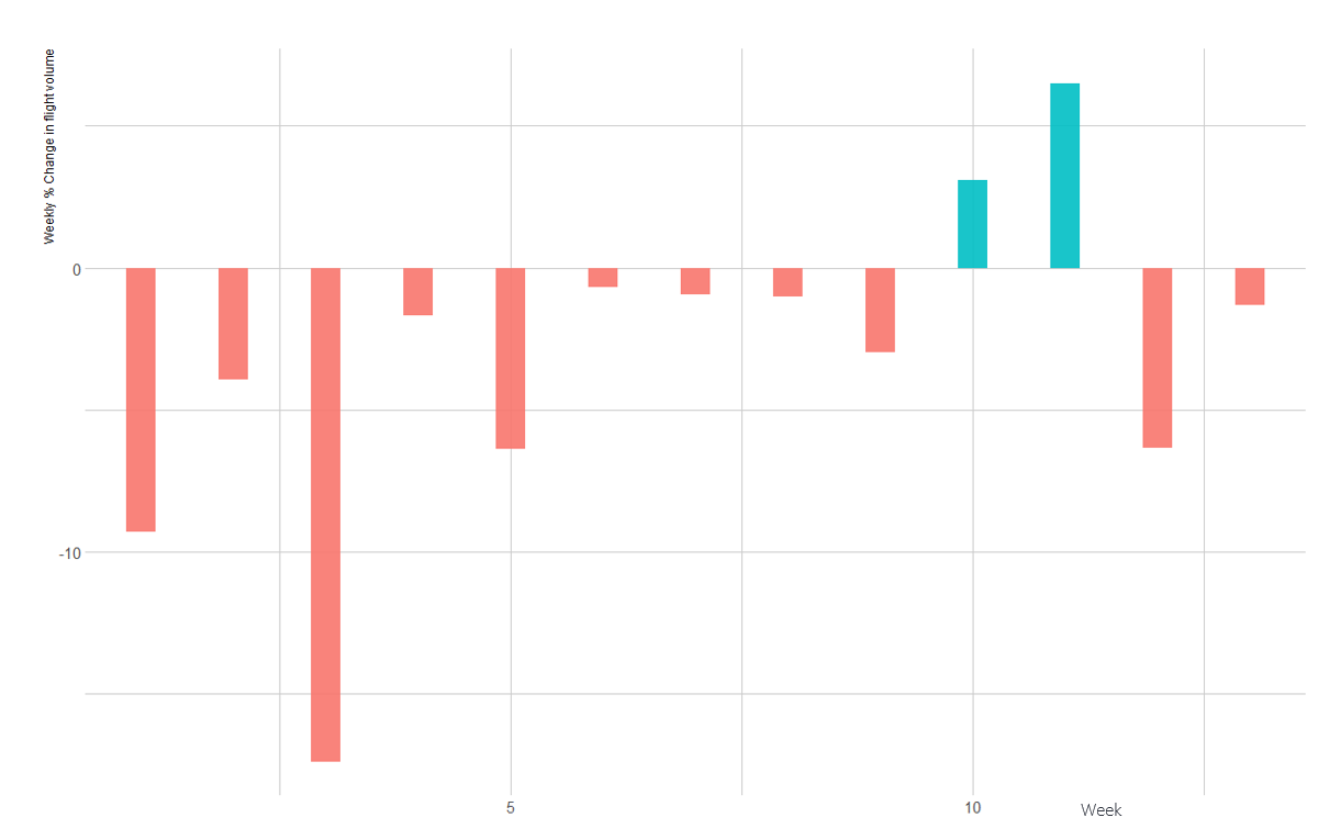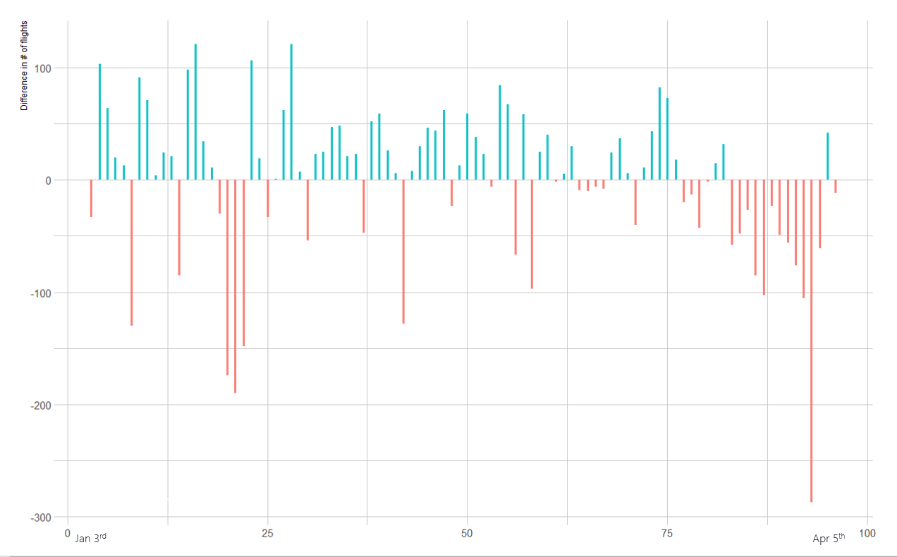 We previously showed this chart up to mid-March, at which point there was no measurable impact of Covid-19 measures on the number of flights recorded.
