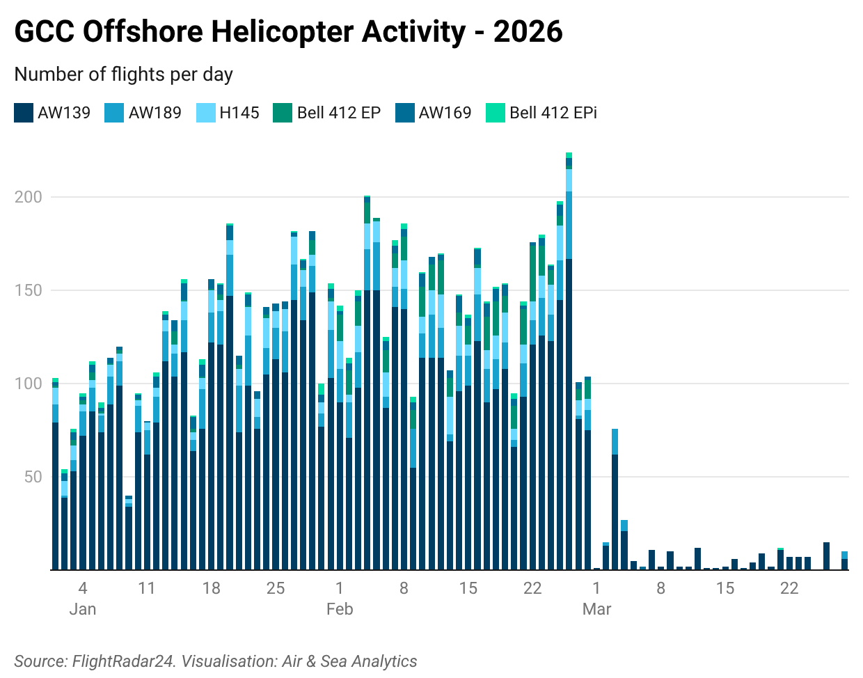 The conflict has effectively shut down routine offshore helicopter operations across much of the GCC: