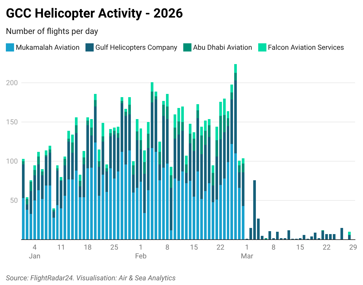 Middle East Helicopter Flight Activity per day by Operator, January - March 2026